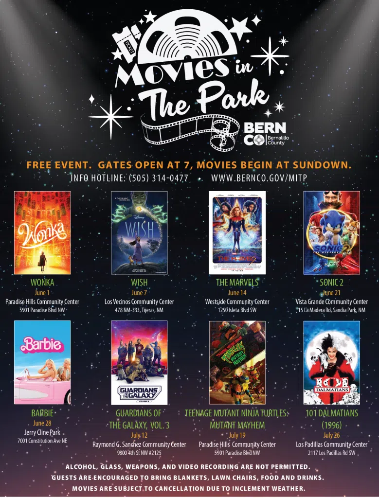 Movies begin at sundown and for information regarding cancelations due to weather, please call our Movies in the Park Hotline, 505-314-0477.