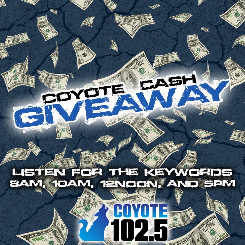 Listen every weekday at 8AM, 10AM, 12 Noon, and 5 PM for the Coyote Cash keyword. When you hear it, enter the keyword here at Coyote1025.com. You’ll be entered to win a thousand dollars!